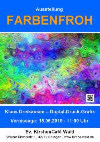 ![]() | 15.06. - 27.08. 2019 Vernissage: 15.06.2019 - 11:00 h | FARBENFROH DIGITAL ART Werke von: Klaus Dreikausen Ev. KirchenCafé Walder Kirchplatz 1 42719 Solingen-Wald Öffnungszeiten siehe Internet: www.kirche-wald. |
